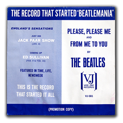 1. The Beatles "Please, Please Me / From Me To You PROMO ONLY SLEEVE" VEE-JAY 581 /M- Special PROMO ONLY sleeve for the very first release of VEE-JAY 581! Really TOUGH to find, and this copy is super nice! All you need is a nice Promo record to add to the sleeve. MB $1,000