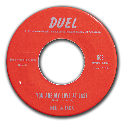 2. Neil & Jack (Neil Diamond) "You Are My Love At Last / What Will I Do" DUEL 508 VG+ULTRA RARE STOCK COPY of Mr. Diamond's very FIRST record!!! These will turn up as Promos once in a while, but I have never seen a stock until now! Small sticker stain on the A-side label. MB $2003. Ricky Nelson "Do You Know What It Means To Miss New Orleans? / BLANK" THEATER PROMOTION RECORD 760