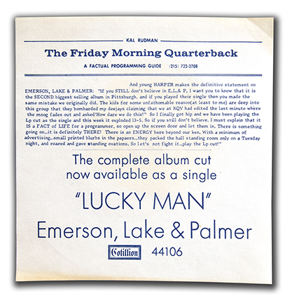 M- WHITE LABEL PROMOHIS VERY FIRST SINGLE!! Wol on B-side MB $200 155. Bob Dylan "I Want You" COLUMBIA 43683 /MINT PICTURE SLEEVE ONLY MB $50 161. Electric Light Orchestra "Sweet Talkin' Woman/Fire On High" JET 1145 MINT PURPLE LABEL PROMO MB $20 163. Emerson, Lake & Palmer "Lucky Man/SAME" COTILLION 44106 MINT WHITE LABEL PROMO with