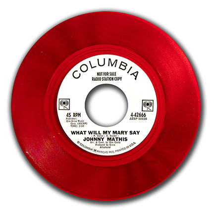 ORIGINAL SHRINK with all TITLE STRIPS, etc. MB $100 243. Johnny Mathis "What Will My Mary Say/SAME" COLUMBIA 42666 M- WHITE LABEL PROMO pressed on BEAUTIFUL RED VINYL with the