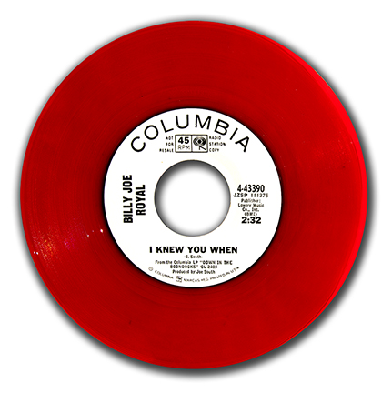 same song on both sides and pressed on gorgeous RED VINYL, sticker stain on label and wol on B-side MB $20 343. Billy Joe Royal "I Knew You When/SAME" COLUMBIA 43390 MINT WHITE LABEL PROMO with